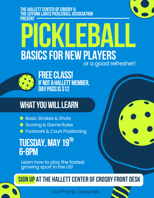 Pickleball Class Learn to Play Pickleball – Class May 19, 2026 6 p – 7:30p Hallett Center of Crosby – Arena Taught by: Cuyuna Lakes Pickleball Association Cost: FREE Sign up at the Front Desk – Hallett Center.