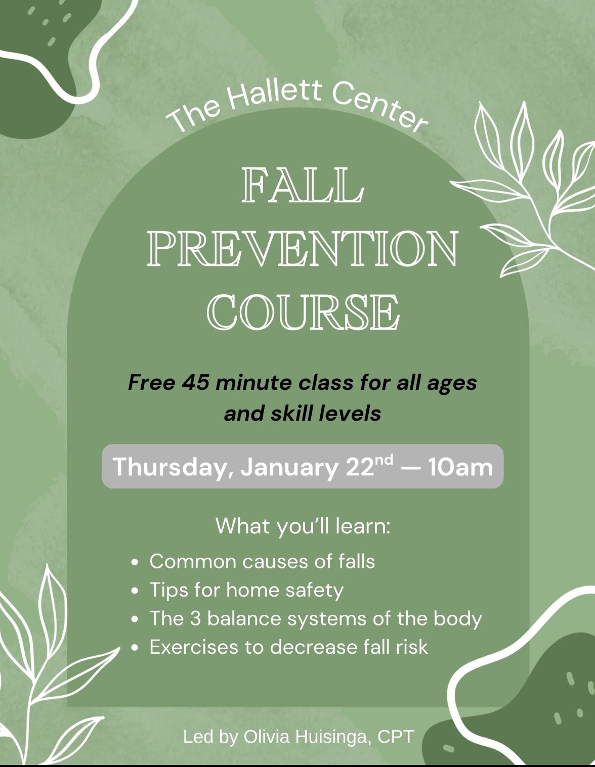 This class will be held in our front meeting room from 10am - 10:45am. Learn causes of falls, the 3 |