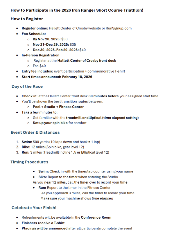 Short Course Virtual: A virtual option is available to be completed between February 14th-20th, 2026. To participate, virtually schedule a day and time with karen.yineman@hfit.com. Participants can complete the event at the Hallett Center or any facility of their choice. Report your time using a fitness app or schedule a day and time to complete the triathlon at the Hallett Center to be timed.