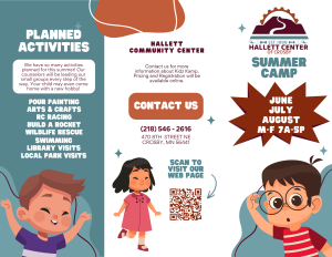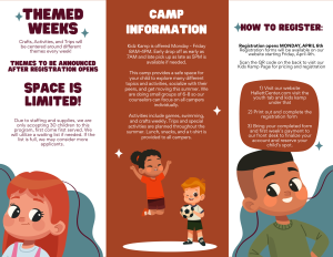 Counselors will be assigned 5-8 children each for small group focus. Groups will be divided by similar age ranges. Due to supplies and staffing, our camp will be limited to 30 kids this year. A camp t-shirt, snacks, and lunch will be provided to all campers. Daily activities include pool time, visits to local parks and the library, games, crafts, and special visits from different organizations.